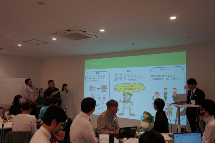 錦二丁目は16街区で成り立っているそうで、それぞれのブロックにしゃべるロボットを設置しようと思っています。主なターゲットは既存の店舗と、新たに錦二丁目に参入する店舗に関わる人。ロボットを通じて知り合う、仲良くなることができれば、売り上げ向上にもつながると考えています。(パッションチーム)