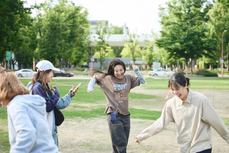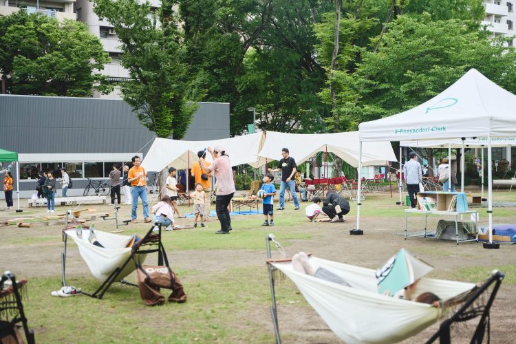 2025年の『あいちフューチャーフェス』。2日目は午前から、FabCafe Nagoya目の前のシバフヒロバで、様々な遊び道具が設置されたプレーパークが賑わいを見せました。実は今回、金城学院大学国際情報学部の学生やOGたちと小さな共創が生まれたんです。大人に、普段なかなかできない“外遊び”を通してバイアス(先入観)について考えてもらったり、単純にリラックスしてもらいたい!という目的を持つ彼女らと意気投合したフェスメンバー。金城学院大とのコラボ企画として、ハンモックの設置や椅子取りゲームなどを実施しました。