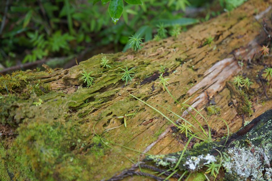 微生物や菌が朽木を分解し、虫やキノコなどの新しい命の住処に