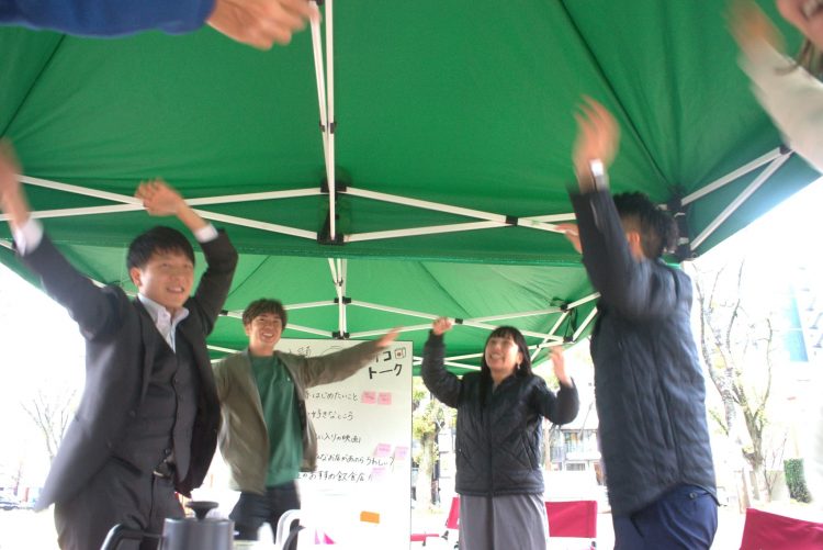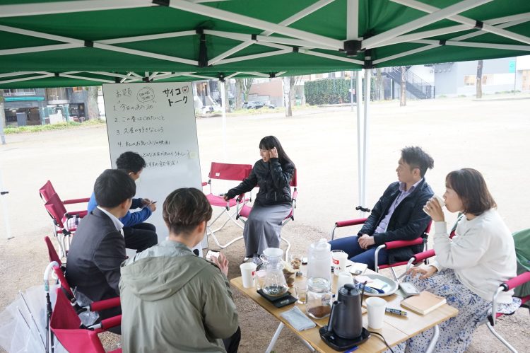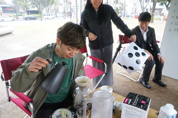 お馴染みのサイコロトーク!サイコロを転がして出た目のお題に合わせてトークするイベントです。お題は「久屋大通公園にどんな店があると嬉しい?」「この春に始めたいこと」そして「今日の当たり目(ダンスをしてノベルティをゲット)」も用意され、世代、趣味、もちろんジェンダーも超えて盛り上がる、笑いの絶えない交流会となりました。小雨が降る中でも温かいコーヒーを片手にホッと一息つきながら、「はじめまして」の方同士でも意外な共通点を発見し、“リアル”でコミュニケーションすることの豊かさを再認識する機会となりました。