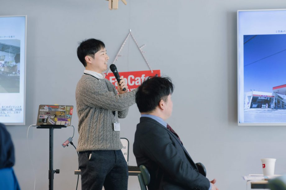忙しい顧客への気の利くサービスを時間ごとに変えて提供したいです。朝は、給油ついでにゆで卵が食べられる“モーニング”サービス。昼間は、マッサージチェアやサウナを設置して疲れを癒してもらう。夜は、店長の趣味で、ウィスキーを出すバーも併設しても面白いと思いました。(参加者)