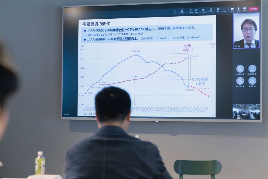 続いて、資源エネルギー庁の宮内 光弘さんががオンラインで登壇。自動車の燃費向上などに伴い、ガソリンの消費活動は、2004年をピークに減少の一途である厳しい需要見通しが説明されました。今後も、カーボンニュートラルへの取組によって、こうしたトレンドが継続することが見通される中、SS事業者は、すぐにでも、経営維持に向けた事業の多角化、協業・経営統合などによる、より踏み込んだ取組が必要であるとの見解が示されました。