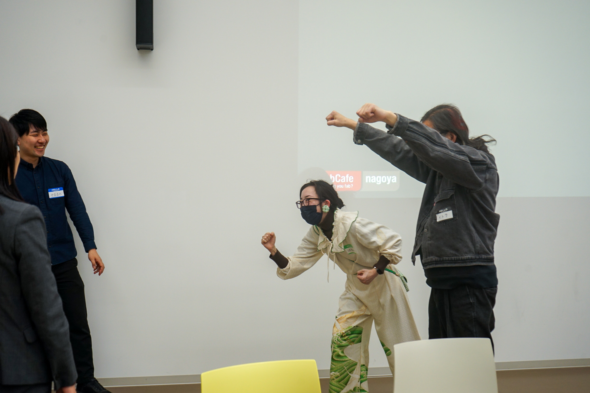 冒頭で今日のゴールは答えを出すことではなく、これから進む方向のスタートラインを見つけることだという考え方が司会進行のFabCafe Nagoya斎藤から共有されます。上手く話そうとしなくていい、自分の言葉で話す、正解を探さない——そんなルールが、安心して対話を行う空気を形成します。さらにアイスブレイクとしてインプロヴィゼーションのボディワークを2つ行い、柔らかい対話の姿勢をつくるために体と心をほぐすことからこの日のワークは始まりました。