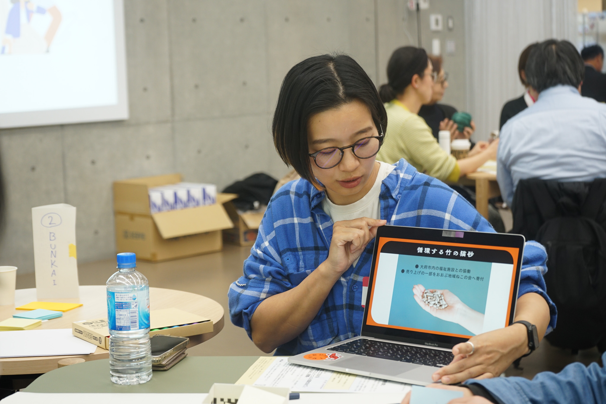 竹から作る猫砂の取り組みについて紹介するBUN-KAI代表 箕浦さん