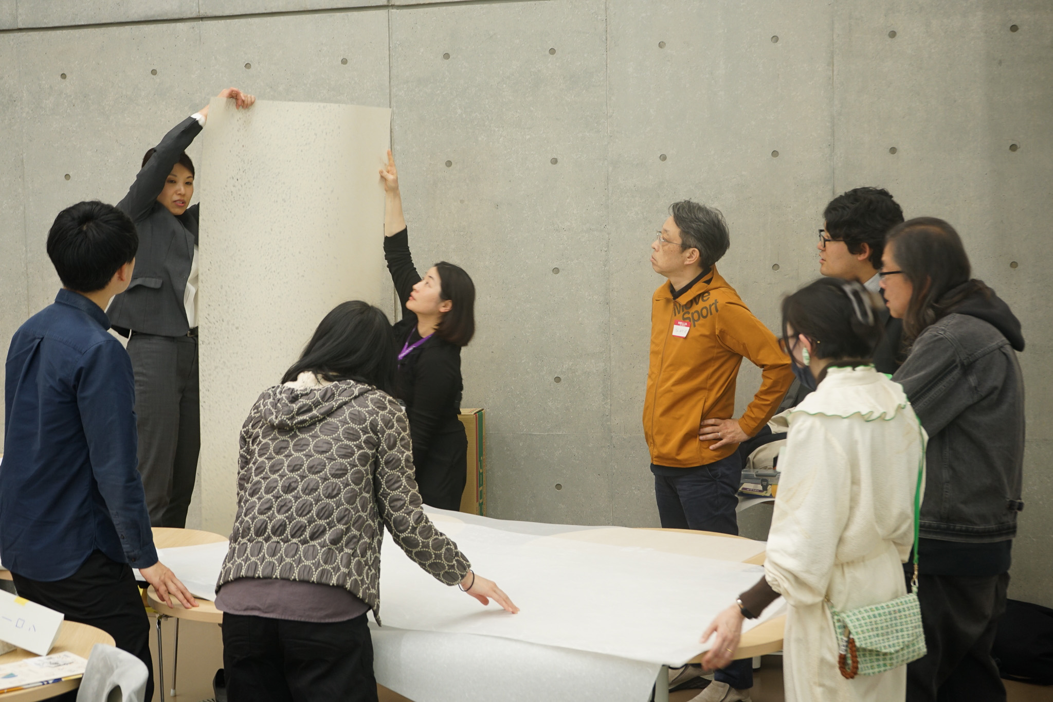 議論では、壁材としての既存の利用例に加え、新しい素材としての展開や立体的な表現への応用、人が思わず触れたくなる感覚的な価値など、多様なアイデアが提示されました。単なる再利用の方法を探るというより、この素材をきっかけに新しい活動や関係性を生み出せないかという方向へ思考が広がりました。