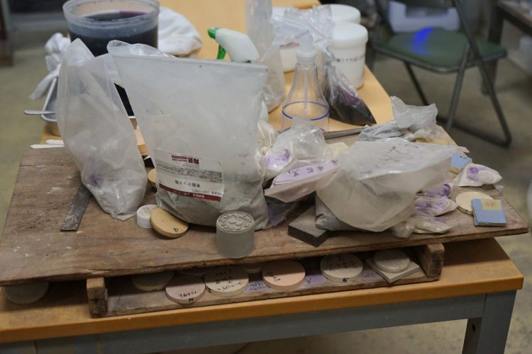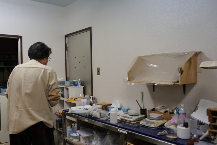 エクシィズのラボ(写真左)では、様々な原料を数mgずつ変えて焼成具合を確かめる「ボタンテスト(写真中央)」などを行う。日々の研究の積み重ねでノウハウを蓄積し、特注の要望に応える。