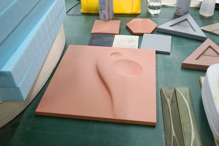 岐阜県多治見市の市街地に本社を構える、株式会社エクシィズ。タイルを扱う専門商社である同社は、工場を持たないながらも小ロットの注文やサンプル制作に対応できる“ファブレス・タイルメーカー”でもあります。対談に伺って早々、社屋を見学させていただくと、様々なタイルの製造・焼成設備があちこちに設置され、オリジナルの形状をした試作品が作業台に所狭しと積み上げられていました。陶磁器の有数の産地である美濃地方。食器類だけでなく、建材として使用される内装タイルも合わせた出荷額は、全て、全国一のシェア(2019年の出荷額の全国シェアは、和食器 約42%、洋食器 約68%、内装タイル 約76% 出典:岐阜県)を誇っています。美濃の土の素晴らしさは、配合によって様々な質感をつくり出すことができること。