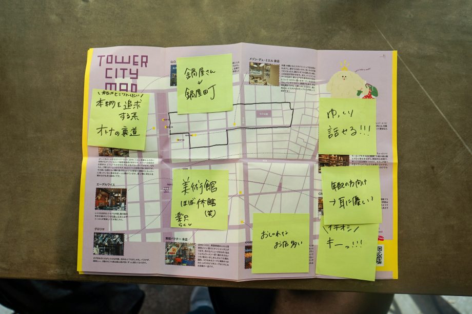 気づきがつながり、まち歩きルートへ。議論が深まるテーブルの上には新たな地図が広がります。