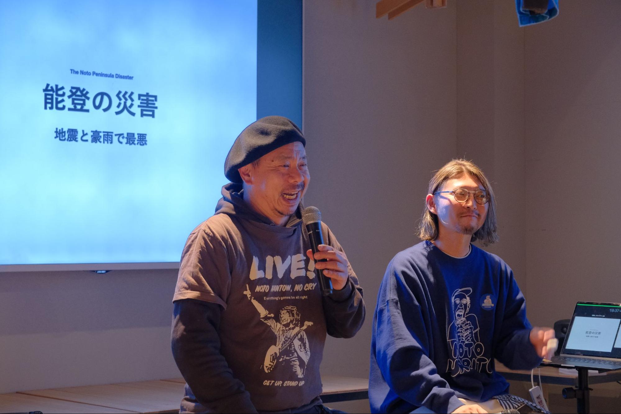 イベントには、2012年より愛知県豊田市にて開催されている「橋の下世界音楽祭」の運営チームの主要メンバーであるNOBさんが駆けつけ、震災後にご自身も参加した数々の能登の祭りの魅力について語りました。2024年9月に開催された「橋の下世界音楽祭2024」では能登の仲間たちが能登の酒や塩などの物産や各種グッズや能登牛などを持って出店しました。