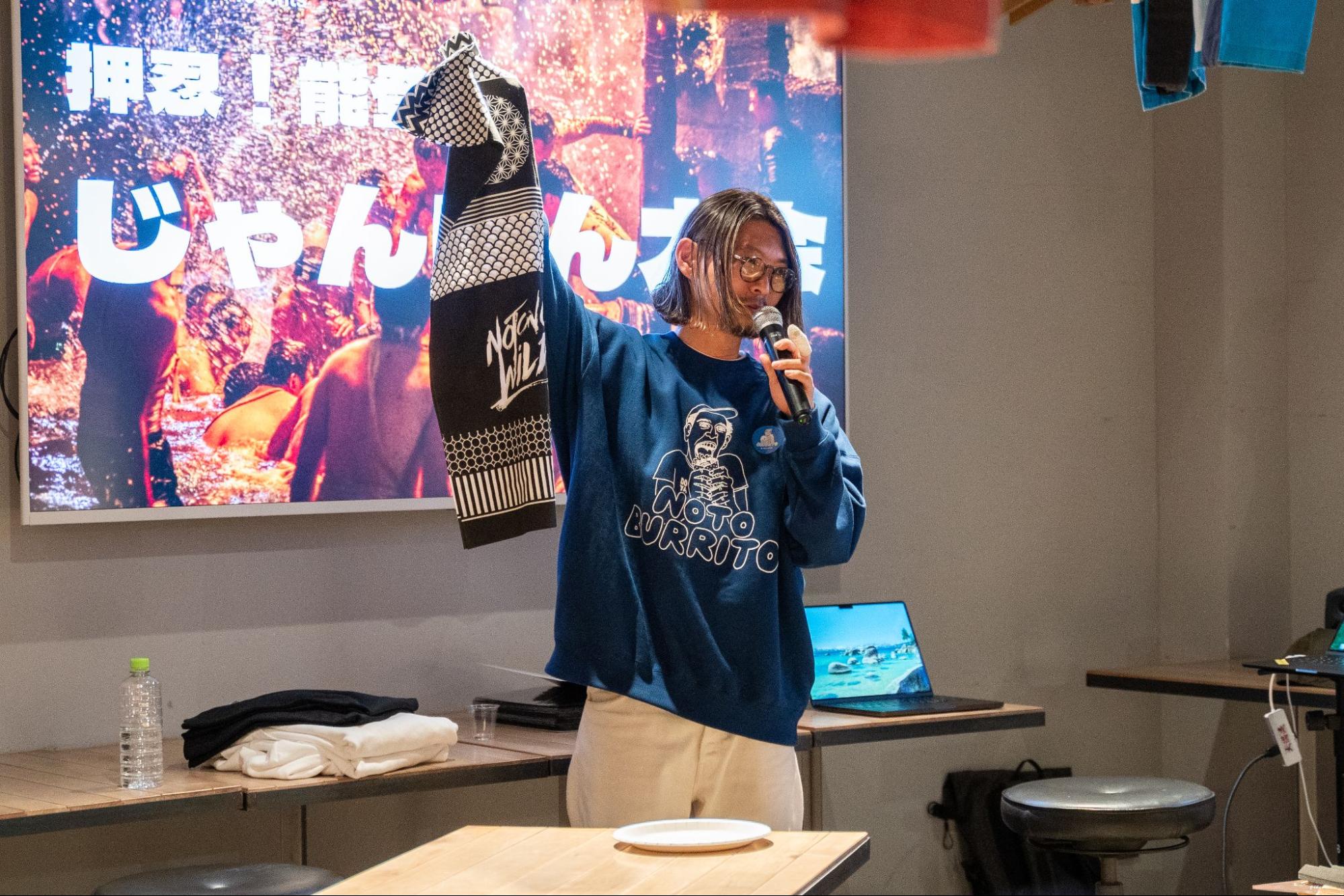 この日のじゃんけん大会では、NOTONOWILDのスウェットや手拭いなどがプレゼントされました。辻野さんによれば、これらのグッズは能登エリアではよく知られており、身につけて歩いていれば「すぐに仲間だとわかる」のだそう。能登のことが気になっていたものの、何から関わればいいかわからなかった人、食に惹かれて気軽にで足を運んだ人、知人に誘われ、半ば偶然参加した人。