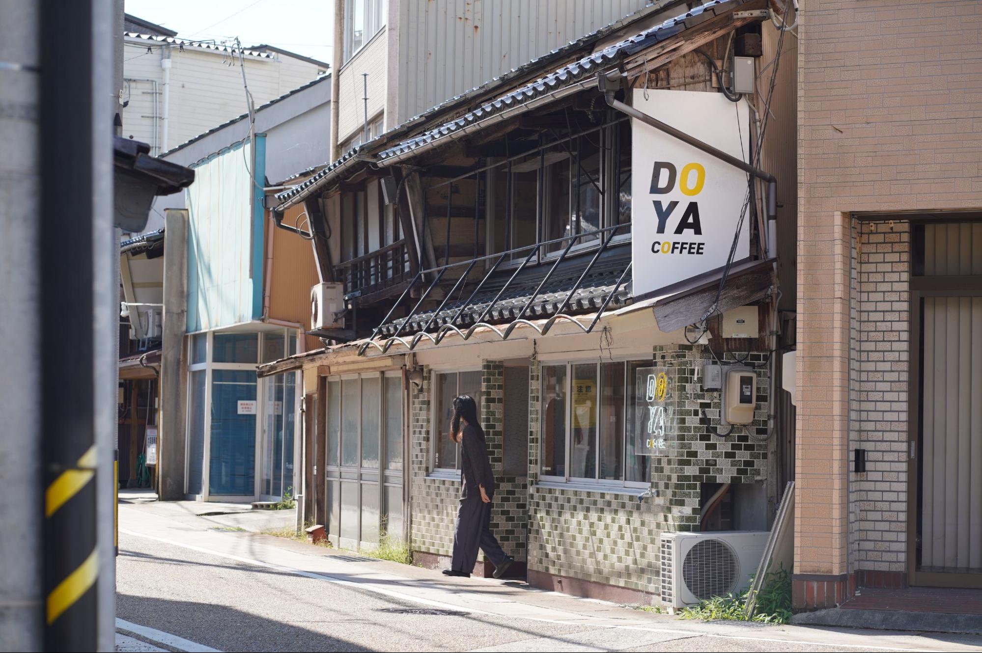 2024年10月に訪問した「DOYA COFFEE」。当時は、建物に部分的な崩壊や傾斜があり、余震による二次災害のリスクが認められる「要注意」の黄色い紙が建物内に貼られていた