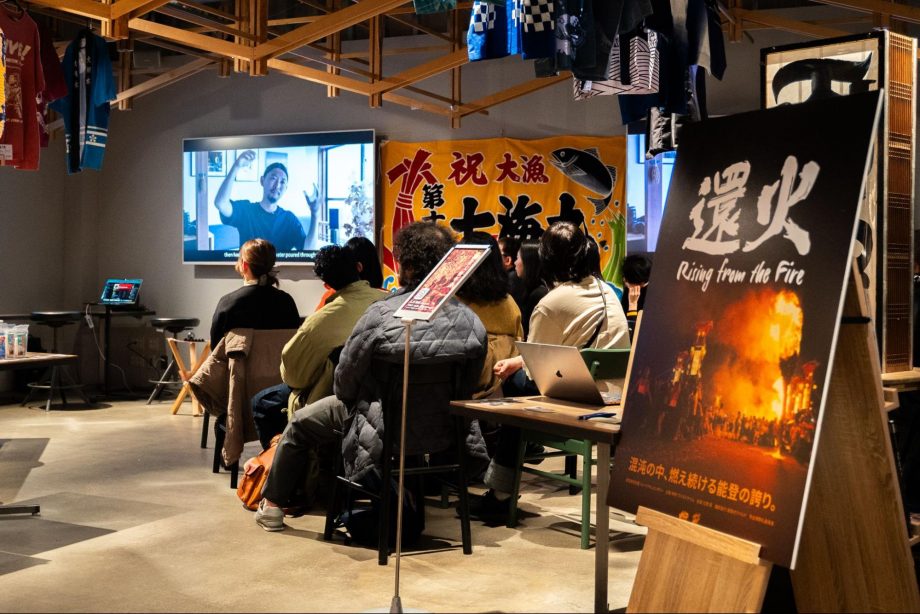 名古屋と東京、それぞれの会場で、Wild Tameが制作した短編ドキュメンタリー『還火 Rising from the Fire』の上映も行われました。本作の語り手は、能登町でDOYA COFFEEを営み、NOTONOWILDの活動を続ける辻野実さんです。この映画は、辻野さんの地域再建の歩みを伝え、祭りが希望の象徴として受け継がれていることを伝えます。