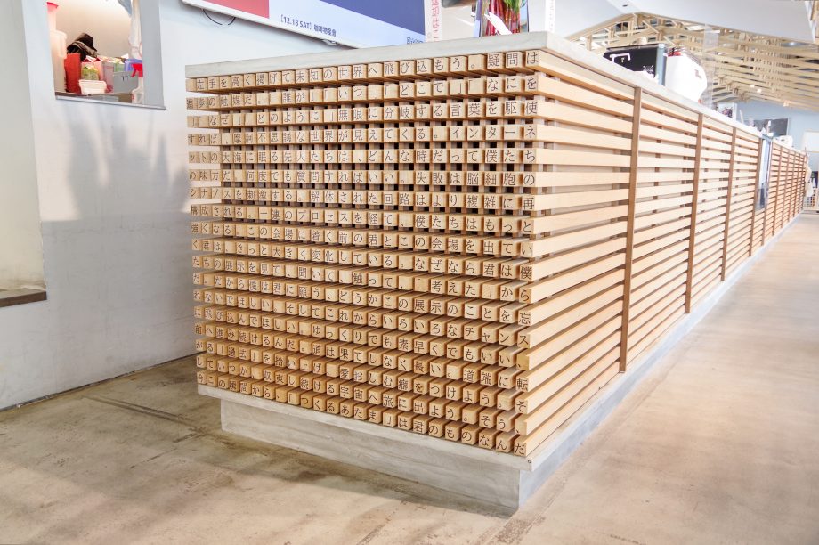 2021年11月にFabCafe Nagoyaにて開催した「つくるもの、つくるあたま」展では、店内カウンターの左右壁面に対となる文章、フードメニューに付いてくる文庫本ペーパー、影で読むことのできる透明人間作品などを展示。