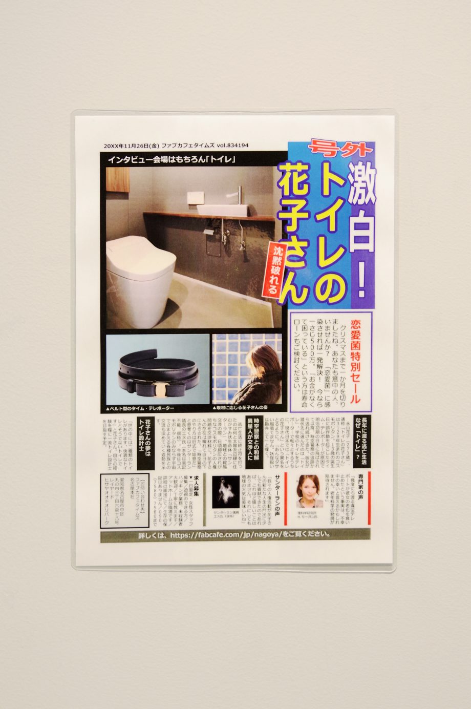 そういう意味で、今回の展示の中での中川さんの表現は特に印象的でした。カッティングシートで文字で空間演出をしたり、男子トイレの壁に新聞のようなものを貼ったりしている。最初は気づかなかったんだけど、あれ男性が立ってトイレしようとすると、ちょうど視界に入るっていうね(笑)
