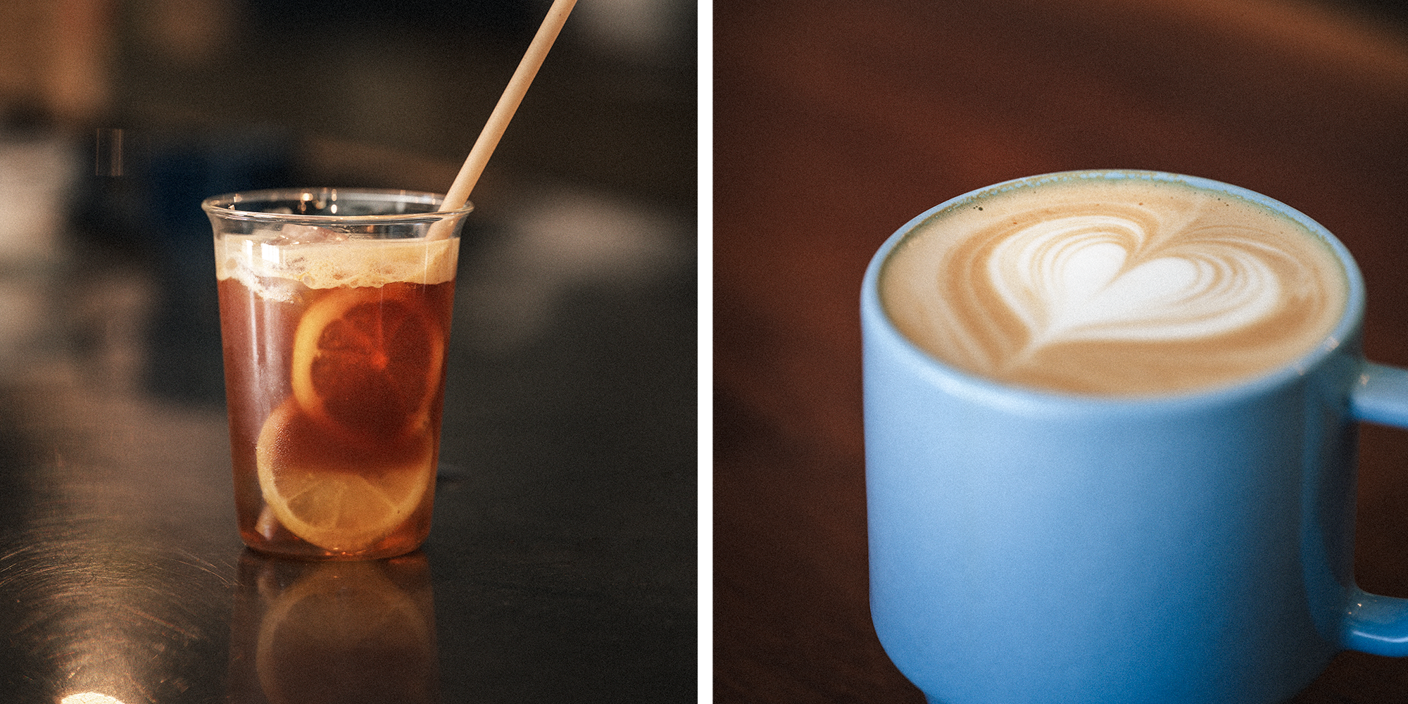 (写真左)コーヒーの香りとレモンの酸味が爽やかな、エスプレッソソーダ。(右)一番人気のカフェラテ。ラテアートの出来栄えもバリスタの腕の見せどころ(写真 @MiuraYoko)