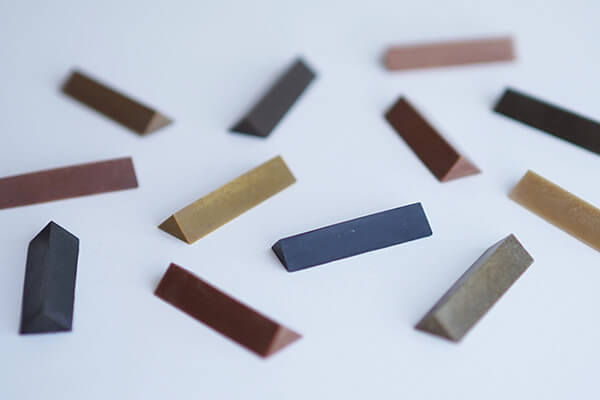 「Forest crayon」は、家具や建材の規格から外れた木材を用いたクレヨンです。材種によってや、日焼けや菌類の影響により、木の色は決して「茶色」ではなく、多様であることに気づきます。 -