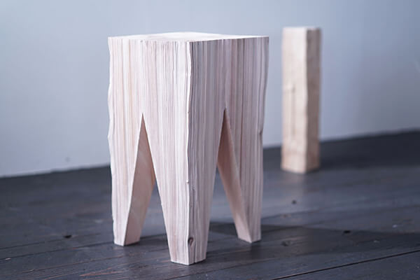 人工的な製材が作り出す数学的な知恵と、かつての生活の風景である薪割りの原始的な知恵を掛け合わせてできた家具です。どちらにも転ばないその佇まいに、私たちは未来のスタンダードの多様性を感じています。 -