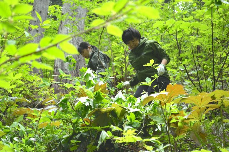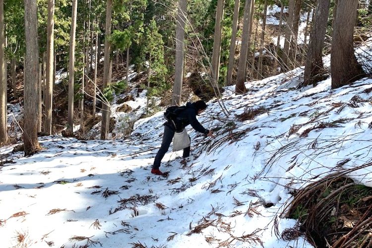 It is a bit difficult to collect kuromoji wood in a steep forest, especially if it is not well maintained, but the FabCafe staff always look forward to going into the woods.