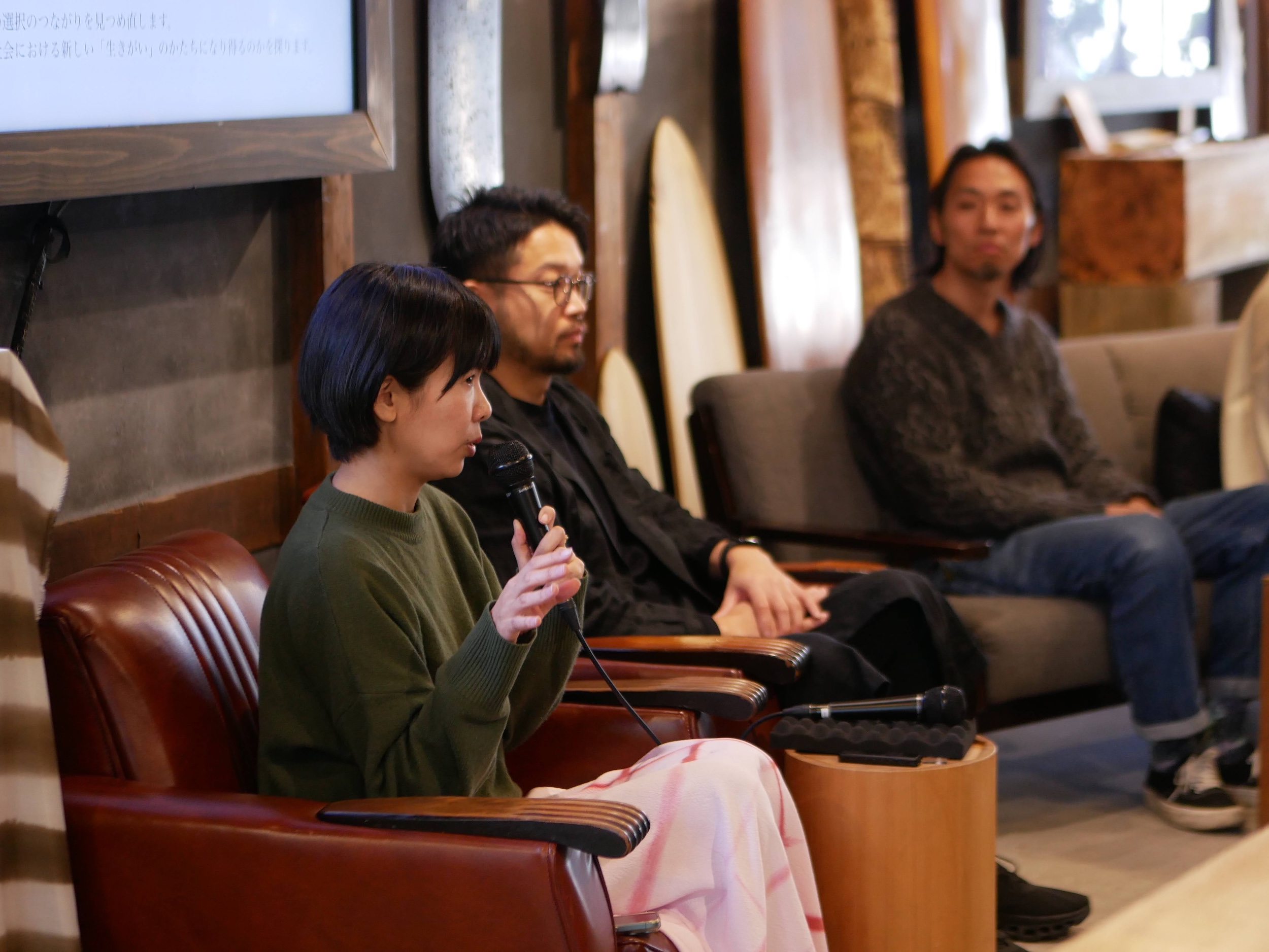 During the artist talk on March 14, the four exhibitors gathered with moderator Kosuke Kinoshita from FabCafe MTRL Kyoto to discuss the ideas behind the show. Yumi Komori (MORI WO ORU), Shinya Kobayashi (MUJUN), Takuya Tsutsumi (Tsutsumi Asakichi Urushi-ten), and Matsumura Soryo spoke about how they ended up in their respective practices, often by accident or through being pulled in by the materials themselves.