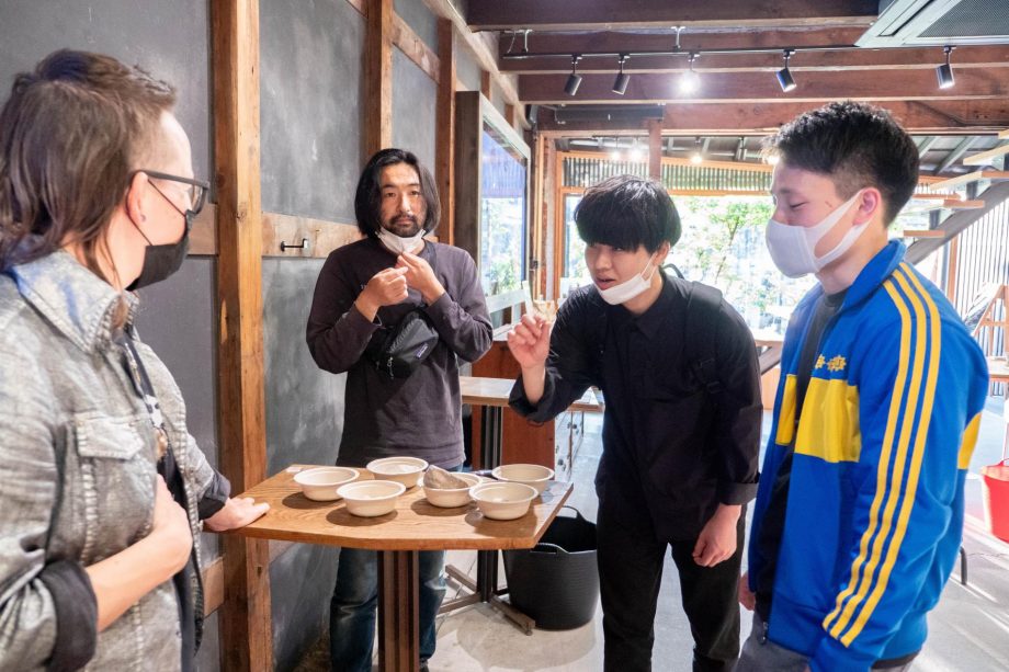 Tsuda (left), Yusato Okuda (center), who is majoring in design research at Kyoto Institute of Technology, and Tanehiro Ogata (right), who is studying food tech at the D-Lab doctoral program at D-Lab as well as developing an education program, talk with masharu and try the samples.