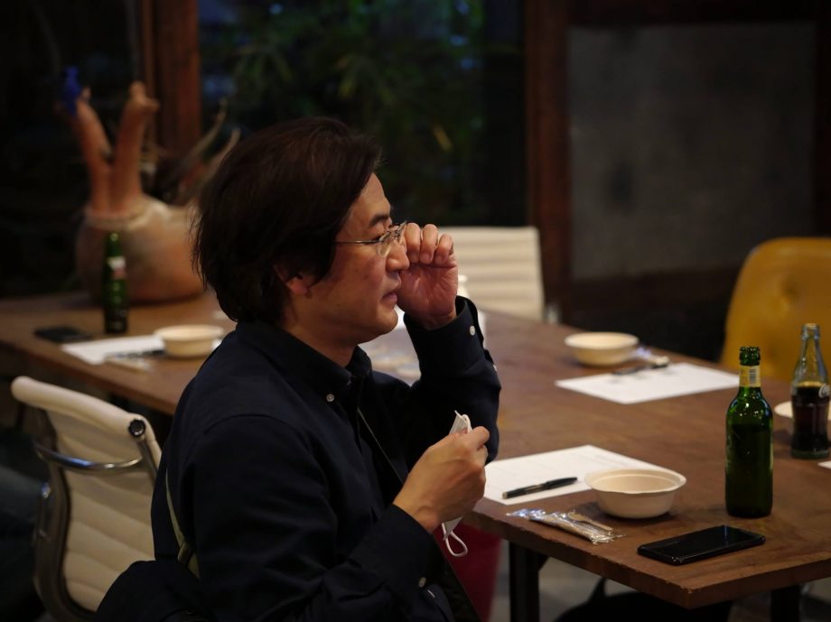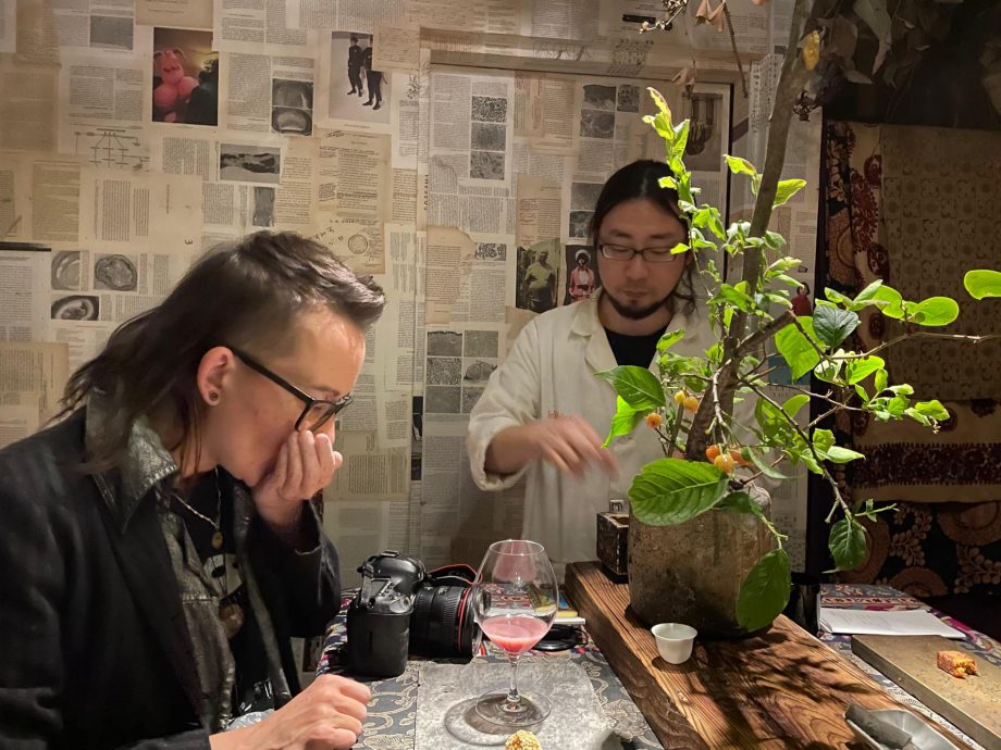 After the meetup, we took masharu to nokishita711, a liquid cuisine bar run by Sekine Motoiki. “It is not a cocktail, but a liquid dish,” Sekine explained, and each of his works was indeed completely different from ordinary cocktails: they included ingredients such as meat, fish or insects, and were prepared similarly to a restaurant meal, following procedures such as fermentation or extraction. Since Sekine also uses soil as an ingredient, his bar was a must-visit stop in our tour.