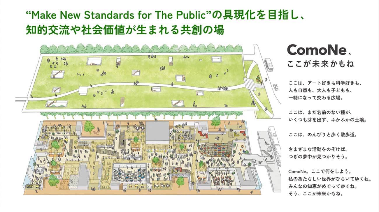 The name of the facility, “Common Nexus,” encapsulates the ideas of shared knowledge (Common) and connections (Nexus). Common Nexus is committed to creating an innovative facility model that seamlessly integrates the functions of a public space — open and accessible to all — with a focus on exploration and co-creation. This approach presents a novel challenge in Japan, as it seeks to establish a pioneering model that has never been seen before.
