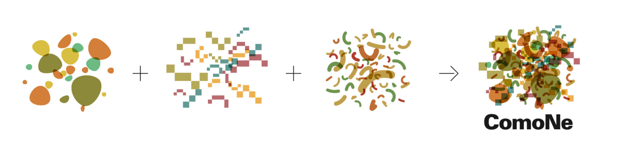 The logo comprises three shapes: organic forms, pixel representations and geometric elements. It reflects the fusion of opposing elements, such as reason and emotion or humanities and sciences, and embodies the essence of ComoNe as a space where these contrasts converge. While the logo uses earth tones to evoke the imagery of the soil, vibrant colours are incorporated into the details to highlight the individuality of the diverse people within the space.