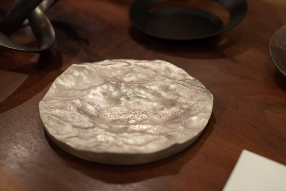 Mr. Ueda participated in the “Kogei Hackathon” through the International Hokuriku Kogei Summit held in Toyama Prefecture in 2017 in an attempt to create new crafts with people possessing digital technology. He takes on interesting challenges that switch between crafts and the digital world, such as capturing the accidental coloring of metal (that is to say, the unconsciousness of the creator) as data and changing it into a line drawing, then carving it into a robot arm and incorporating it into the design. It was a presentation that raises the expectations for future works.