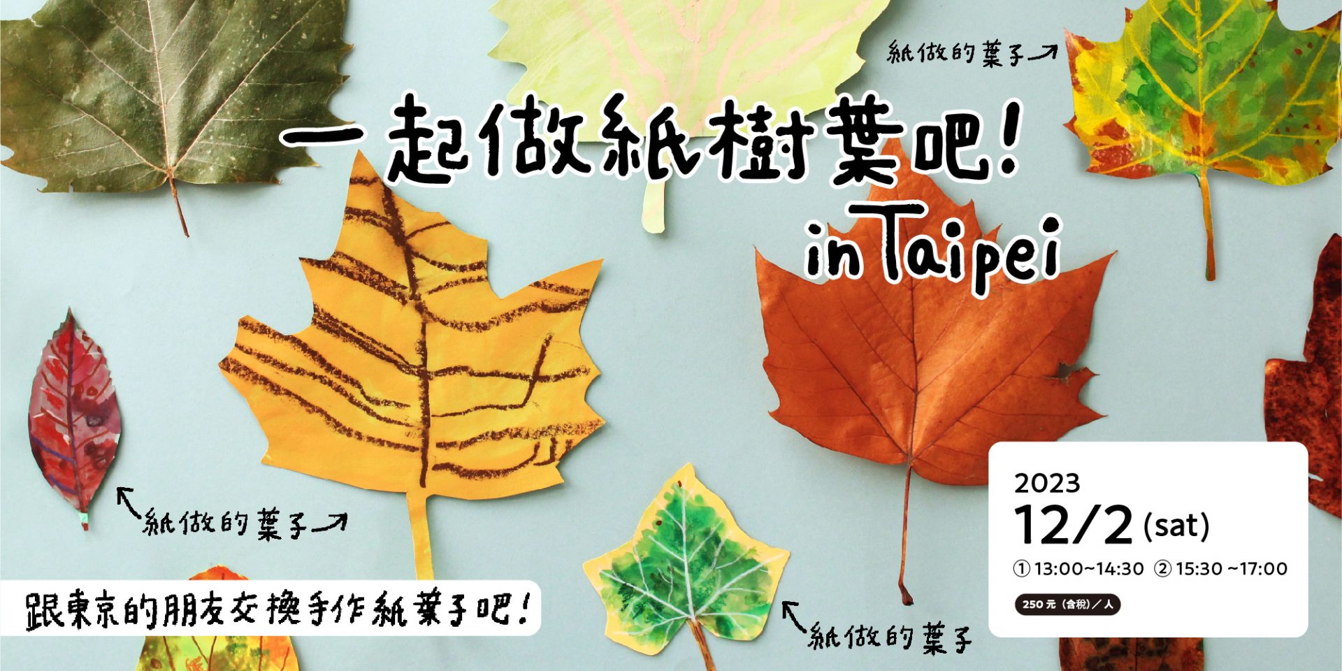 但紙樹葉就不同了!我們預計將12/2(六)大家的作品,與系列活動「一起製作紙樹葉!in Tokyo」中製作的作品進行交換。而台灣與日本一同製作的「紙樹葉作品」預計於12/3(日)起,在Fabcafe Taipei進行展出。
