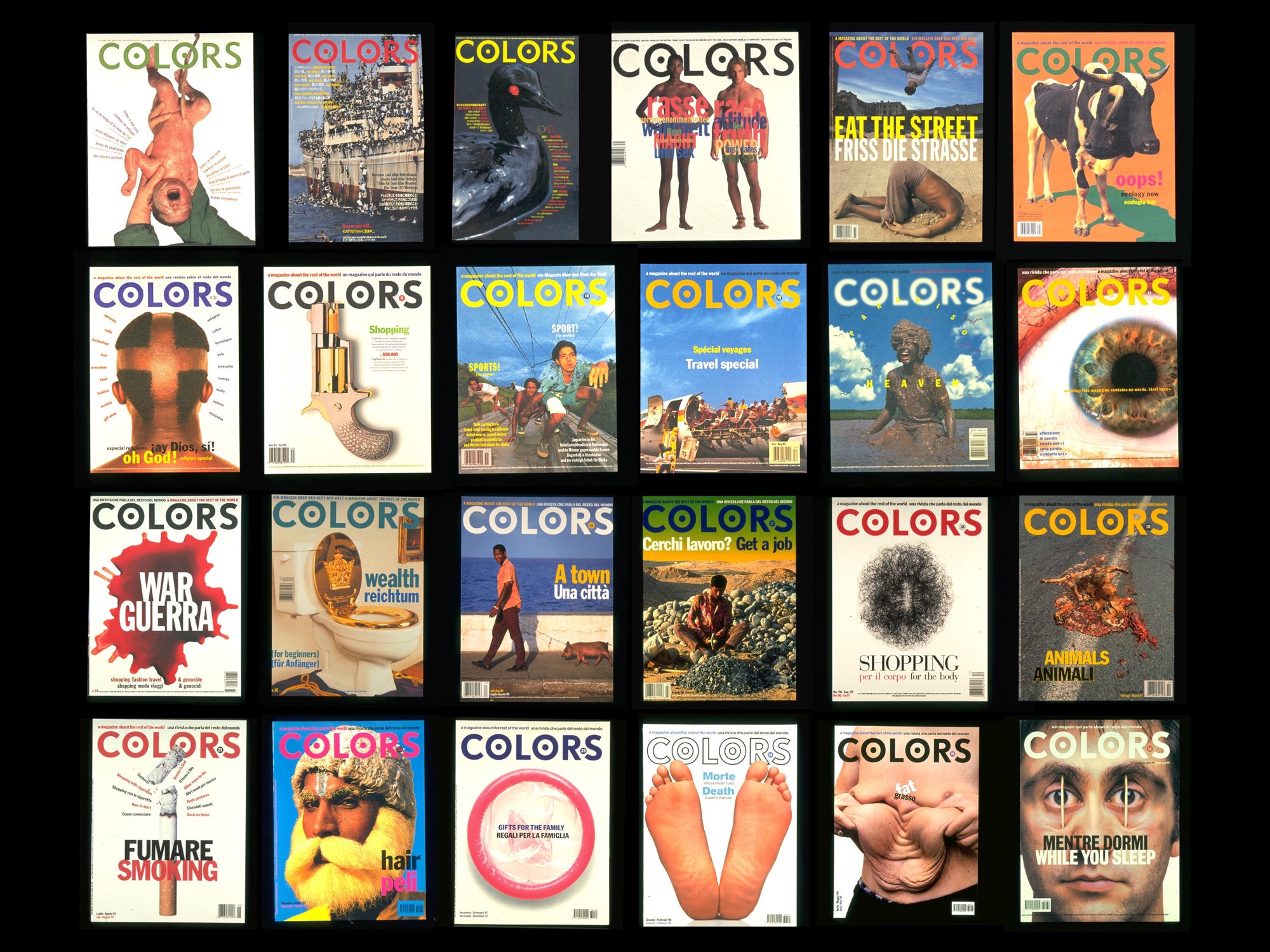 展覽由兩位策展人的個人收藏出發,透過豐富的雜誌、海報與文件,構築出一條流動的觀看路徑。敘事首先帶領觀眾回到安藤忠雄所操刀的物理空間,理解這座創意場域誕生的背景與建築初衷;接著藉由時序推移,呈現跨越二十年的創作脈絡——由毛灼然引領回望 2000 年代《COLORS》所展現的視覺實踐與社會觀察,再由黃若潔銜接 2010 年代從產品設計與策展出發的美學方法延伸。最後,展覽以三十週年的相關文獻與短片素材收尾,在時空交錯中回應 FABRICA 於世界設計史的位置,並深度探討其對當代創意環境的意義。